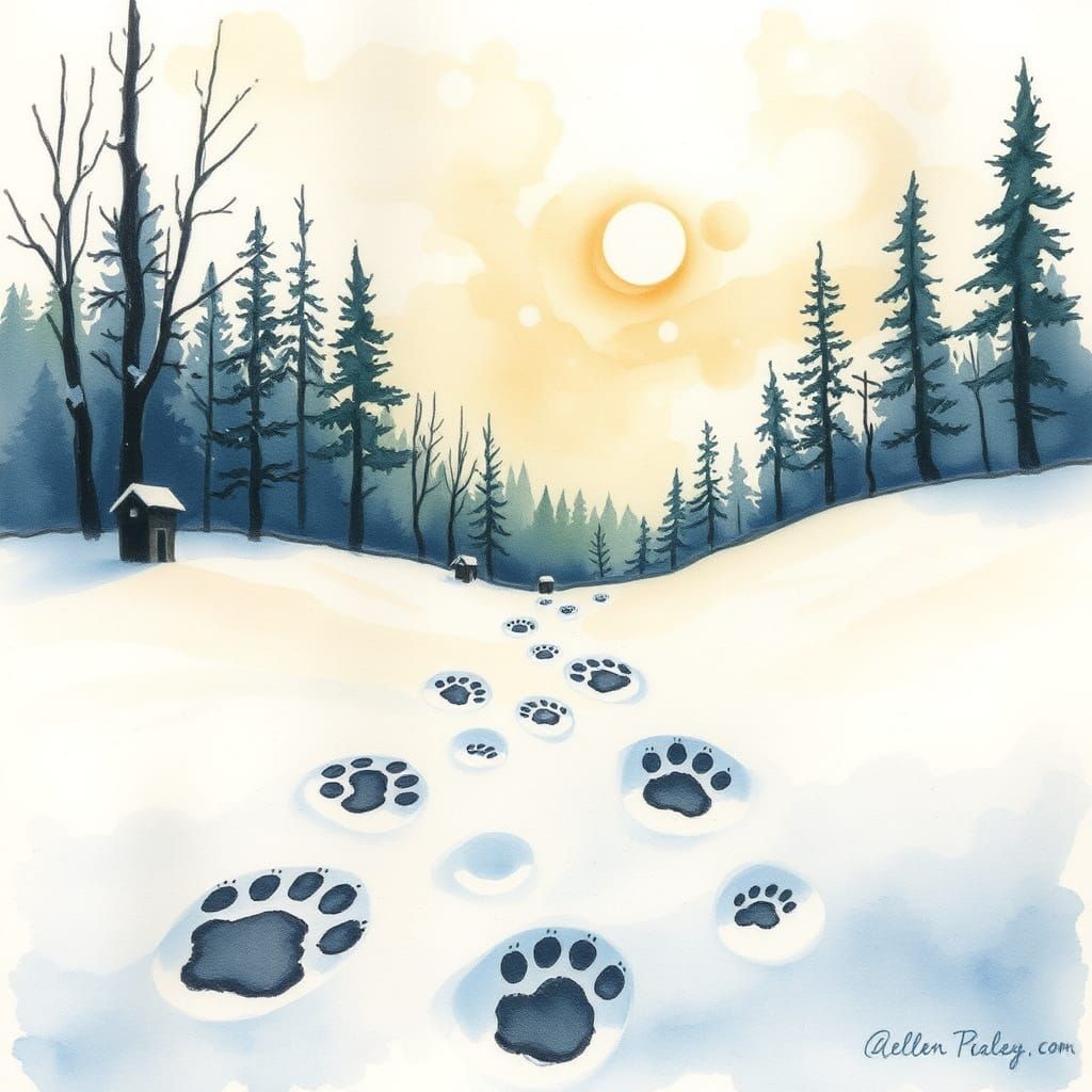 This image is a serene watercolor painting of pawprints leading into a winter wonderland scene, evoking a sense of peacefulness and magic.