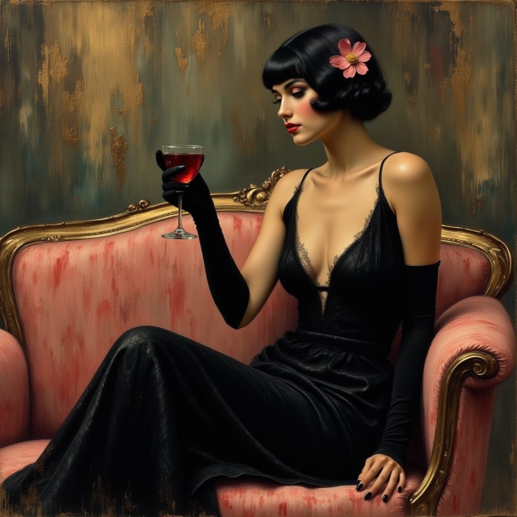 An elegant 1920s flapper in a black dress and gloves sits on a vintage sofa, holding red wine. Rendered with textured brushstrokes in an art deco style, featuring dramatic lighting.