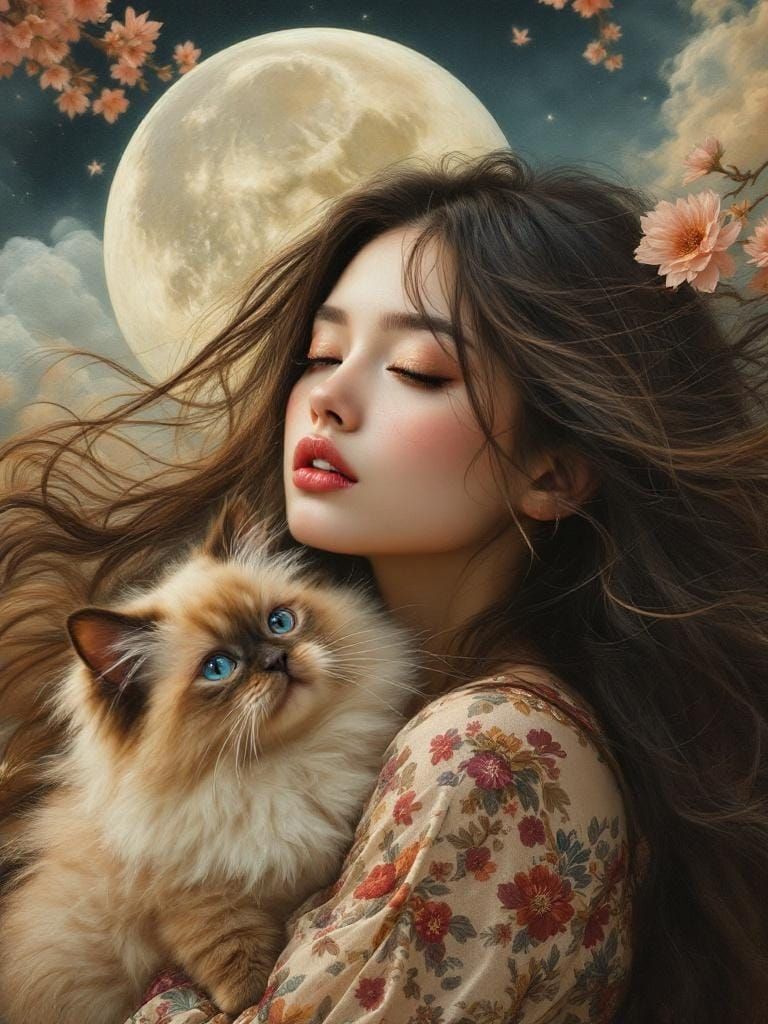 A surreal painting shows a woman with her hair styled as fluffy Siamese cats, set against a backdrop featuring a large moon. The artwork is rich in detail, rendered in warm colors.