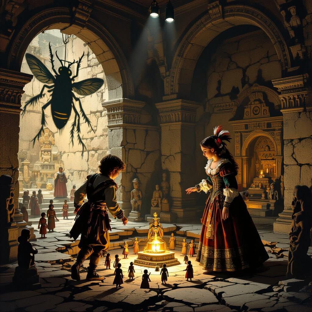 This image shows two children stumbling into a magical museum. One falls into a miniature world of Mayan priests and carved totems. The scene features dramatic chiaroscuro lighting.