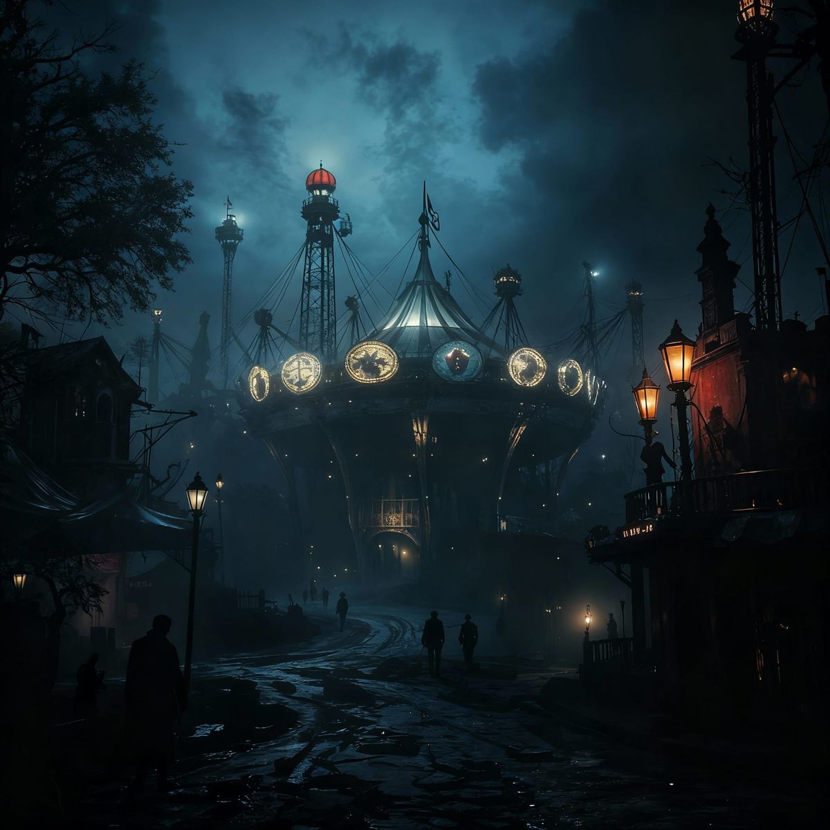 This image captures a sinister, fog-shrouded vintage circus and theme park. Dim lights hint at a mysterious and unsettling presence within the abandoned grounds.