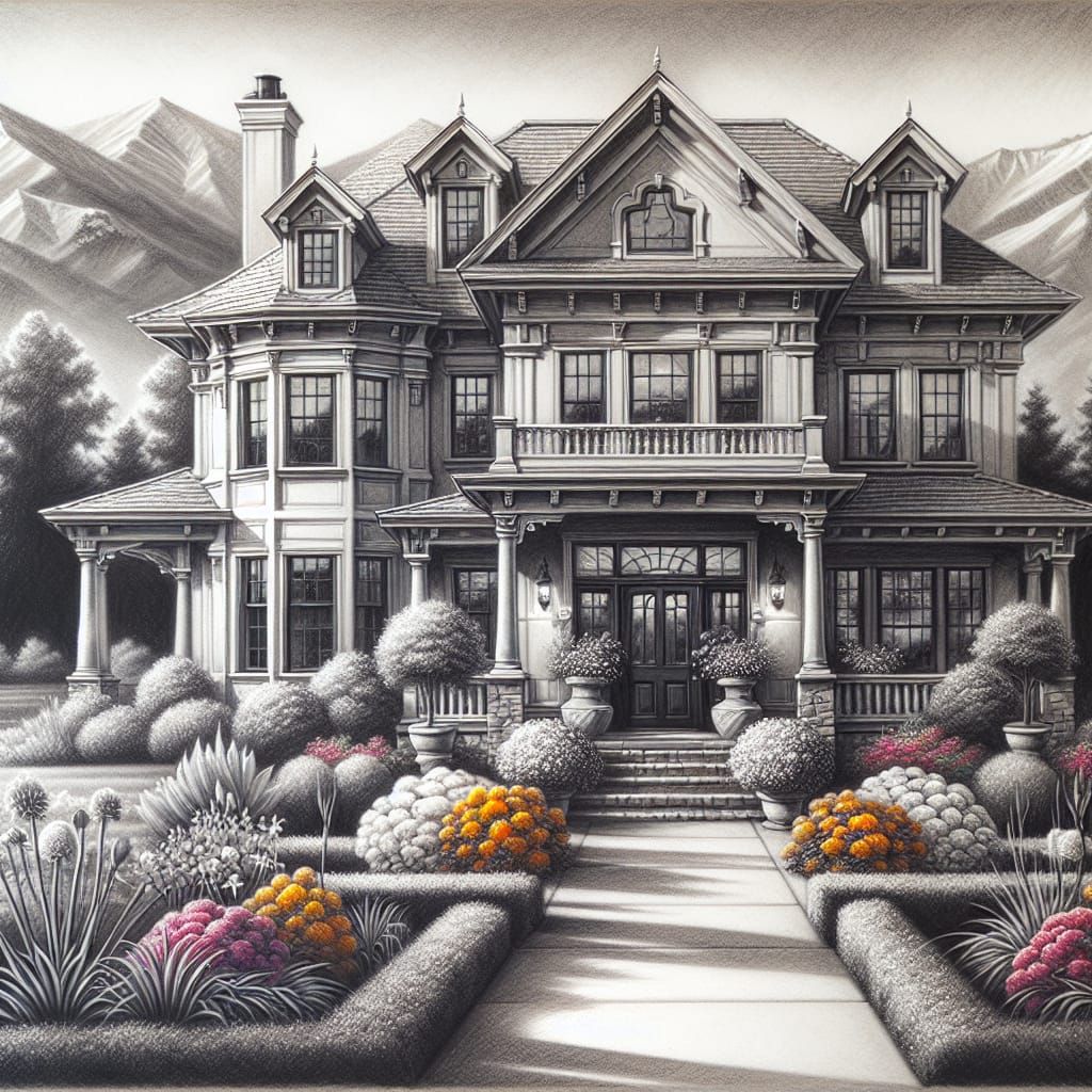 This serene image depicts a stately Georgian-style home surrounded by a lush garden and vibrant flowers, set against the majestic backdrop of the Colorado mountains.