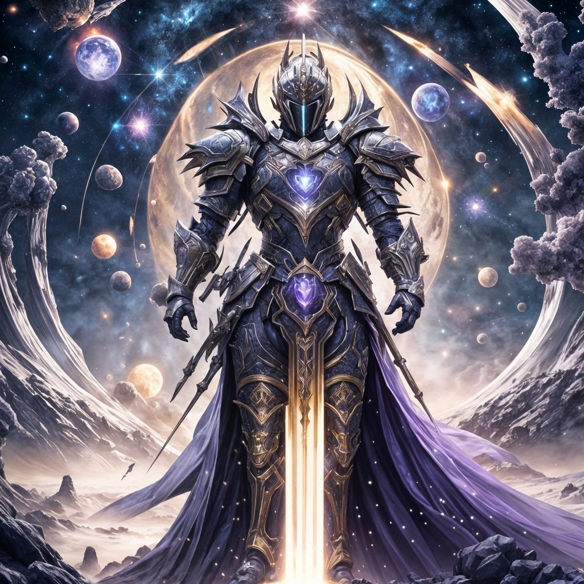 This image features a royal gothic space knight, depicted with realistic detail and an ethereal, divine radiance in a cinematic, retro film aesthetic.