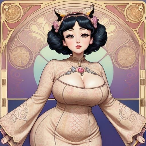 This enchanting portrait features a stunning anime character inspired by the elegance of Art Nouveau. With intricate patterns, soft golden lighting, and warm pastel colors, this image showcases a beautiful, curvaceous figure with a playful and sensual charm.