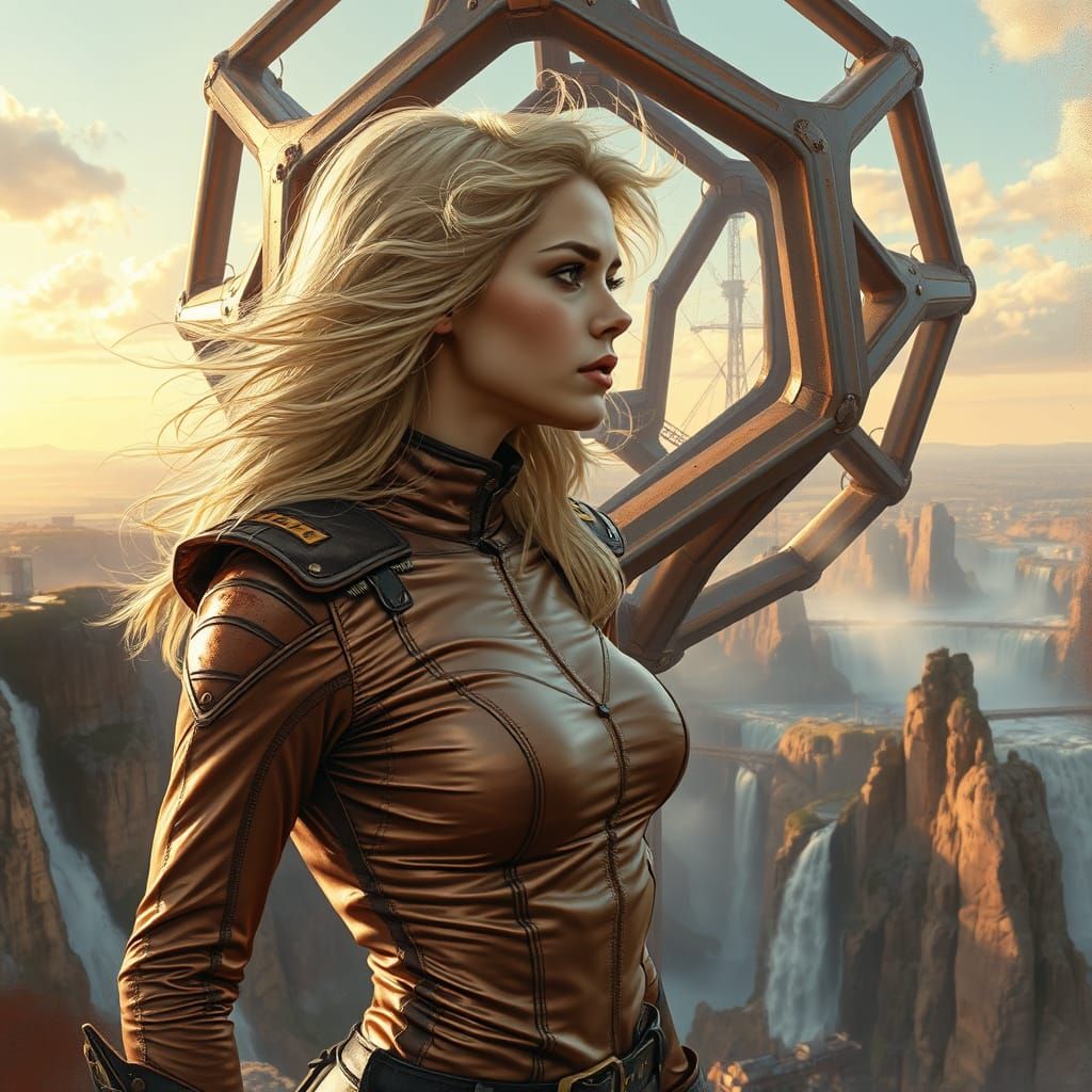 A steampunk woman in a copper suit overlooks a futuristic city. The image evokes industrial futurism with vibrant colors, painted with expressive brushwork and a golden hour backdrop.