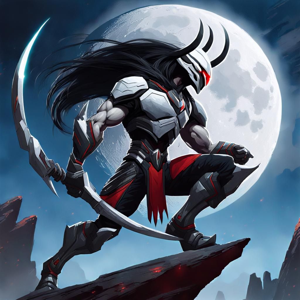 A digital illustration of a muscular, taupe-skinned humanoid monster standing on a cliff under the moon. The creature features a horned head, red eyes, tusk mouth, silver armored legs and a red loincloth, in a phyrexian style.
