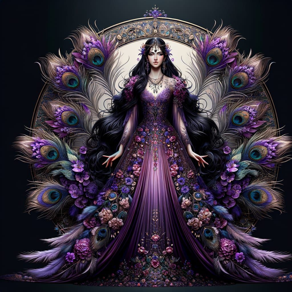 This image shows a regal, mythical queen of the heavens in a stunning, intricately designed dress featuring vibrant purple peacock feathers. Her long, dark hair flows elegantly down her back, exuding opulence and sophistication.