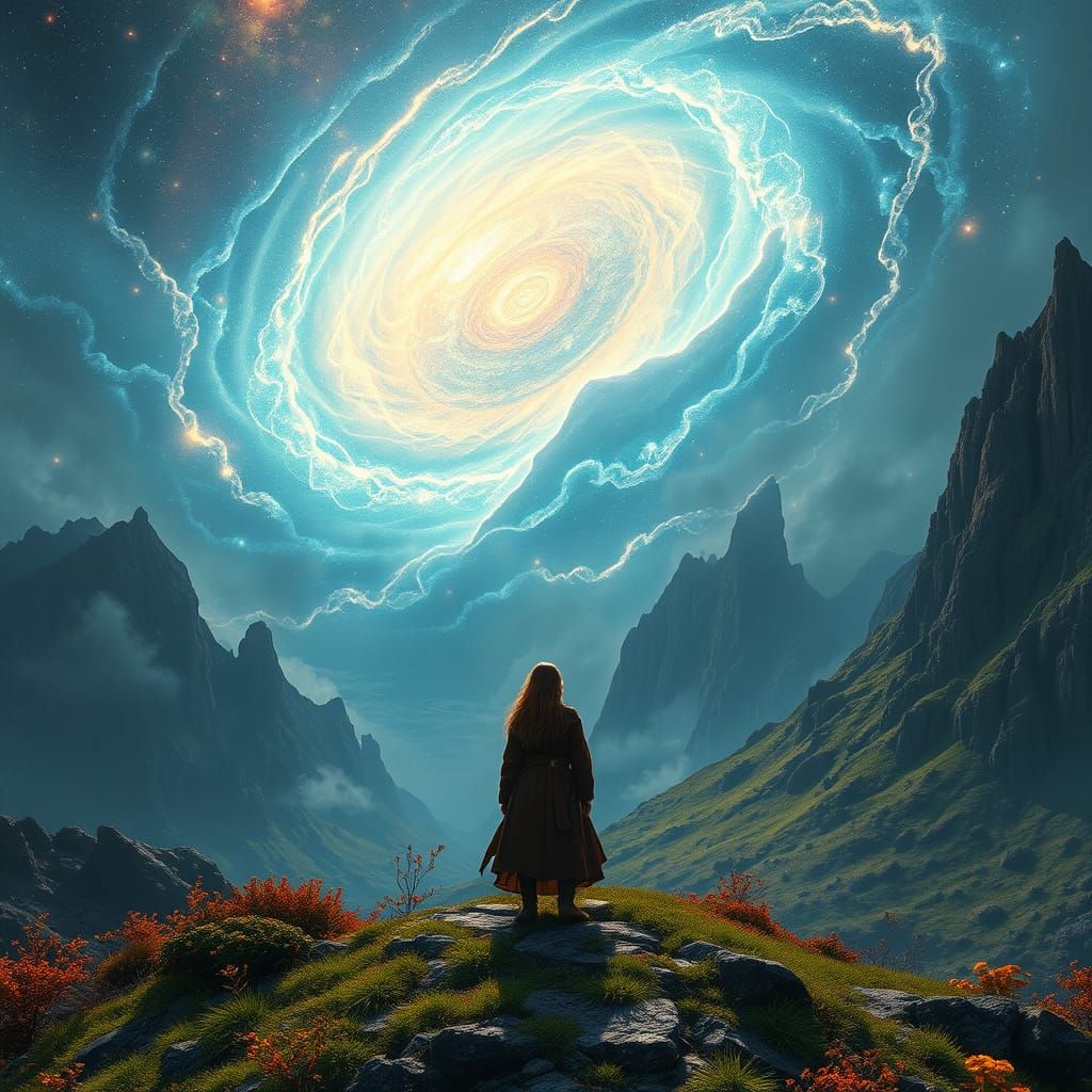 A lone shaman in earthy robes stands on a vibrant Earth, looking up at a massive, glowing nebula of machine entities. Hyperrealistic style with dramatic lighting, inspired by digital painting and concept art.