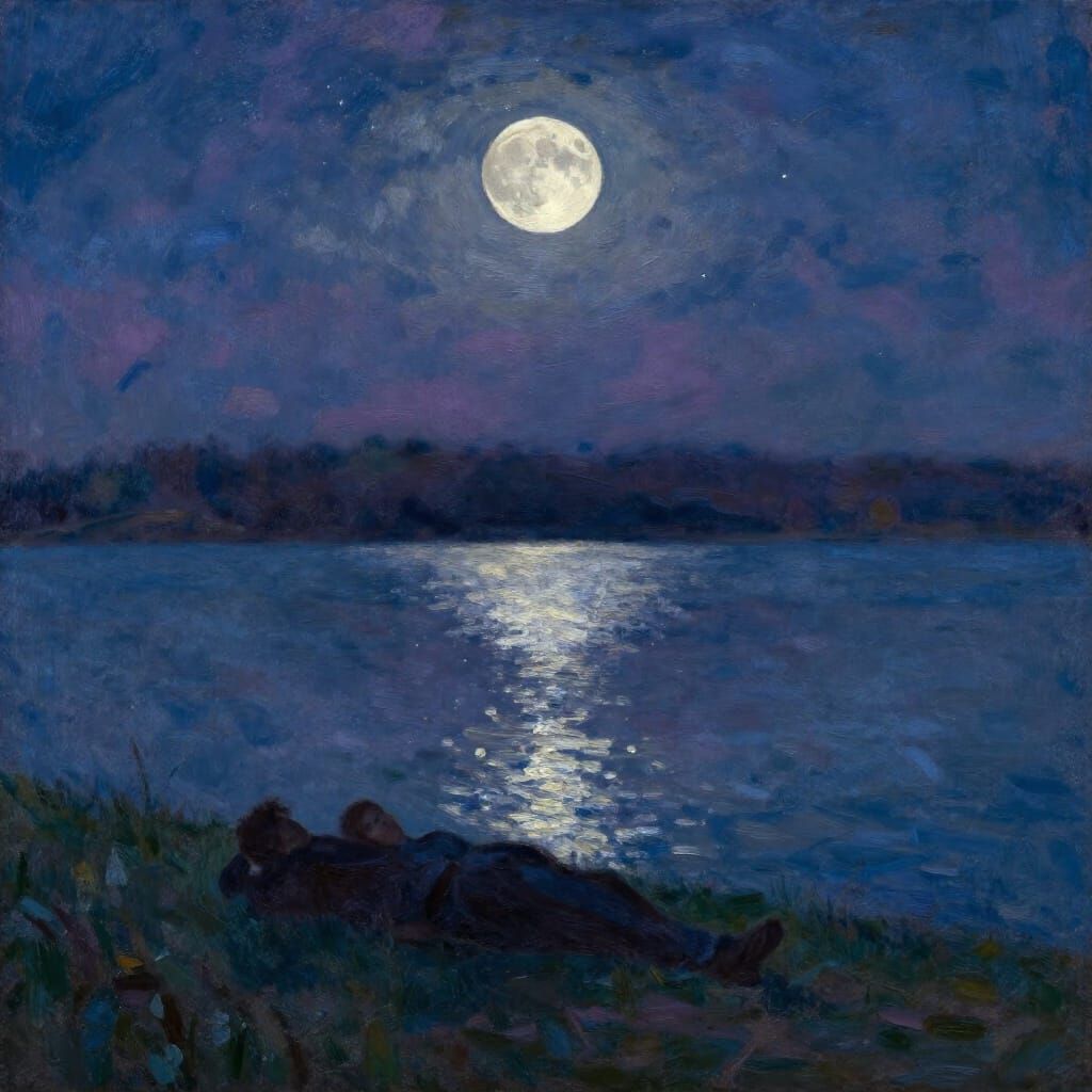 This image depicts a tranquil lake under a full moon with stars reflected on the water. Two figures rest on a hill overlooking the scene, painted in a romantic, impressionistic oil style with soft brushstrokes and deep blues and silvers.