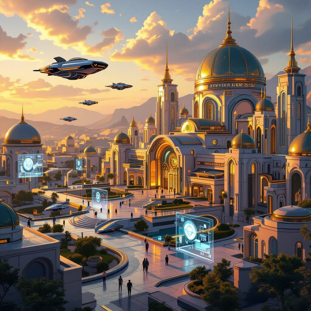 This image showcases a stunning, futuristic university campus with advanced engineering marvels. Featuring deep, fantastical colors and intricate detail, it evokes innovation and wonder.