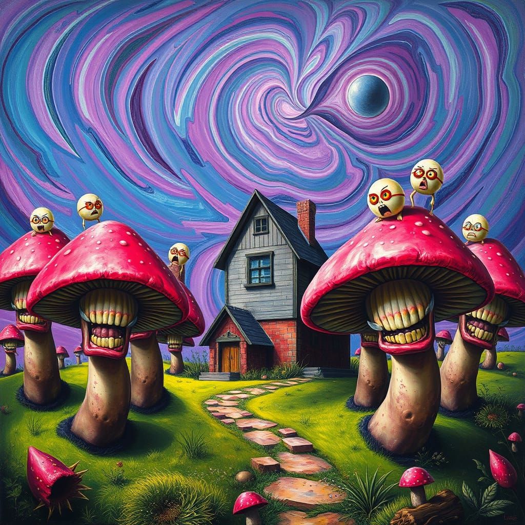 This image shows grinning, sharp-toothed mushrooms spewing angry eggs towards a bewildered house, painted in a chaotic, dreamlike style with vibrant magenta and emerald hues.
