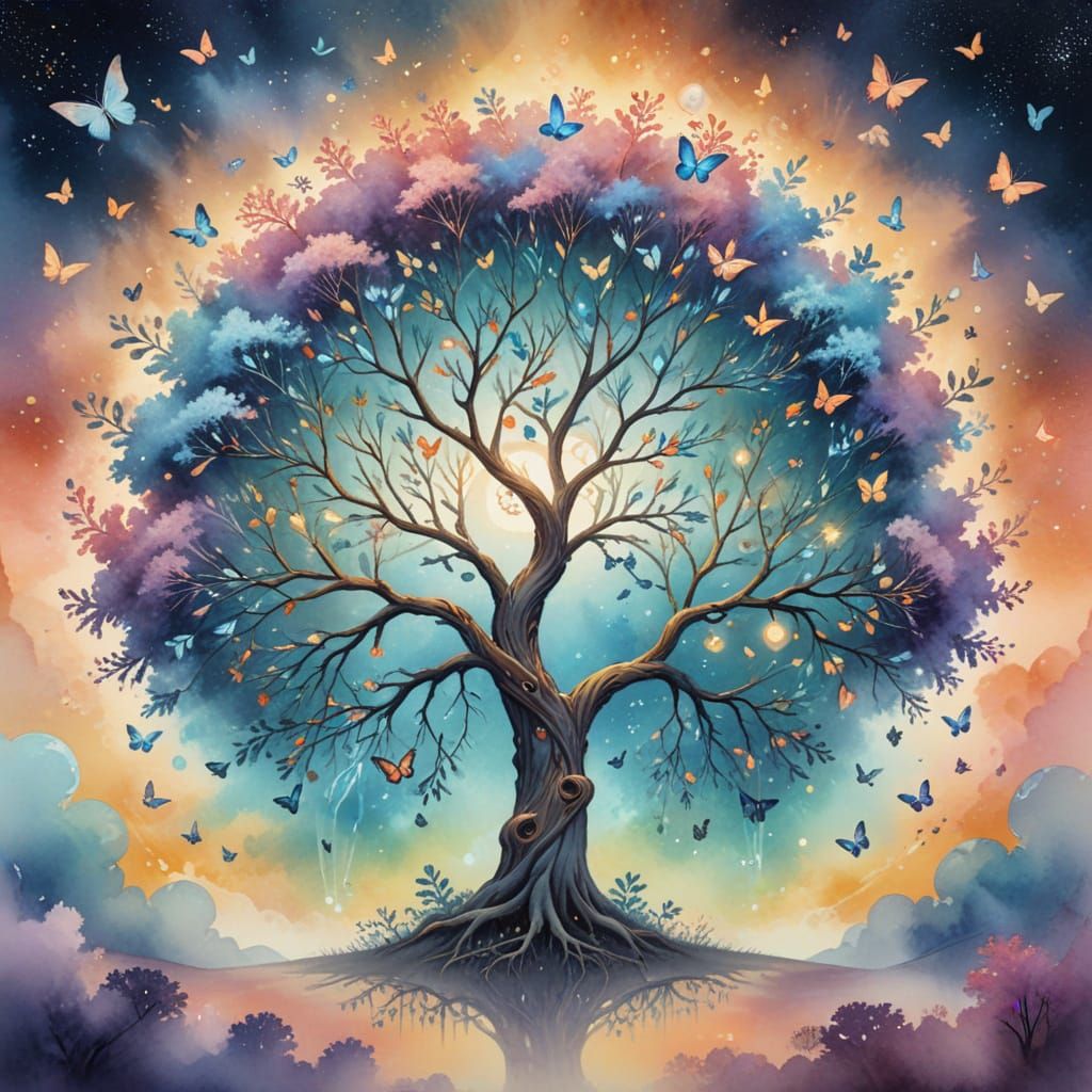 A striking picture of a tree of life in a watercolor landscape. The branches reach to the sky, adorned with glowing orbs and butterflies. Soft pastel colors create a fantastical scene.