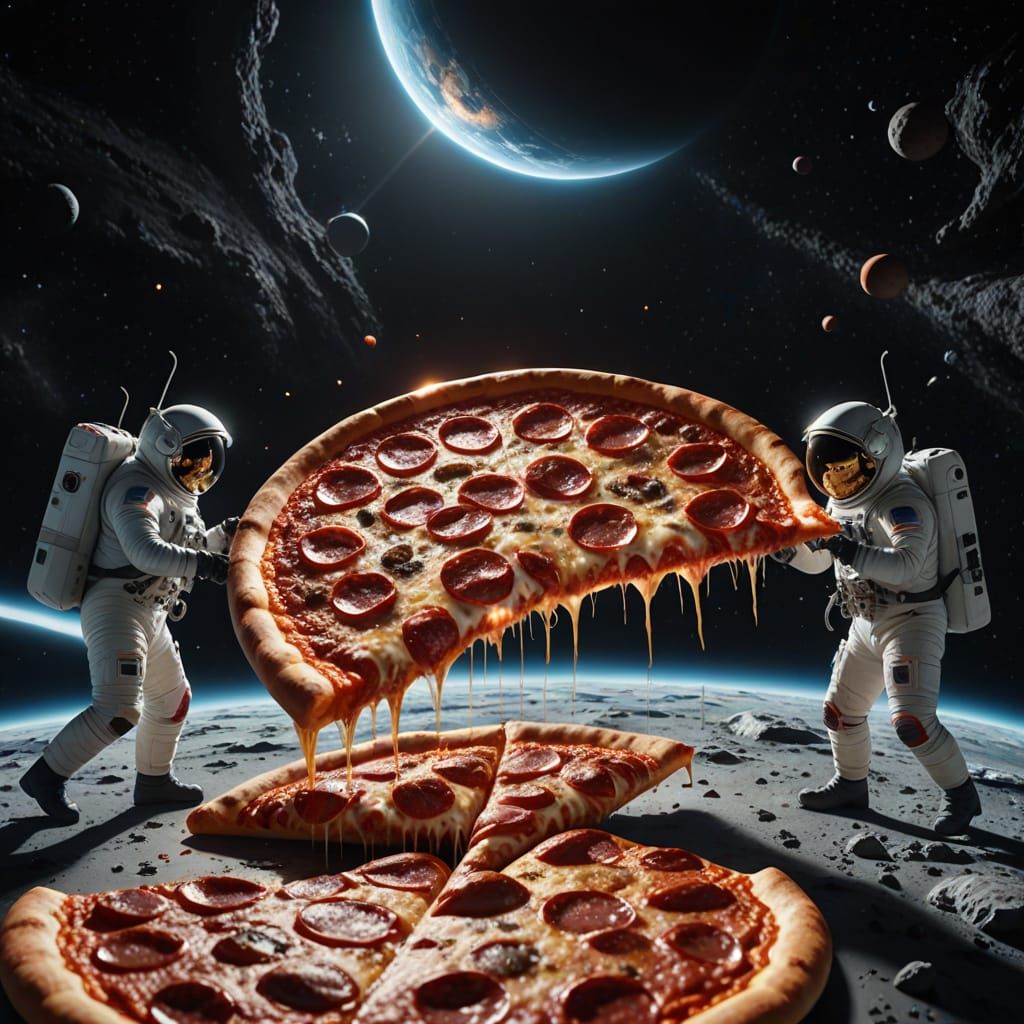 This image shows a giant pepperoni pizza floating in space. Astronauts in spacesuits eat the cheesy surface, which reflects starlight. The digital artwork features dynamic lighting and intricate details.