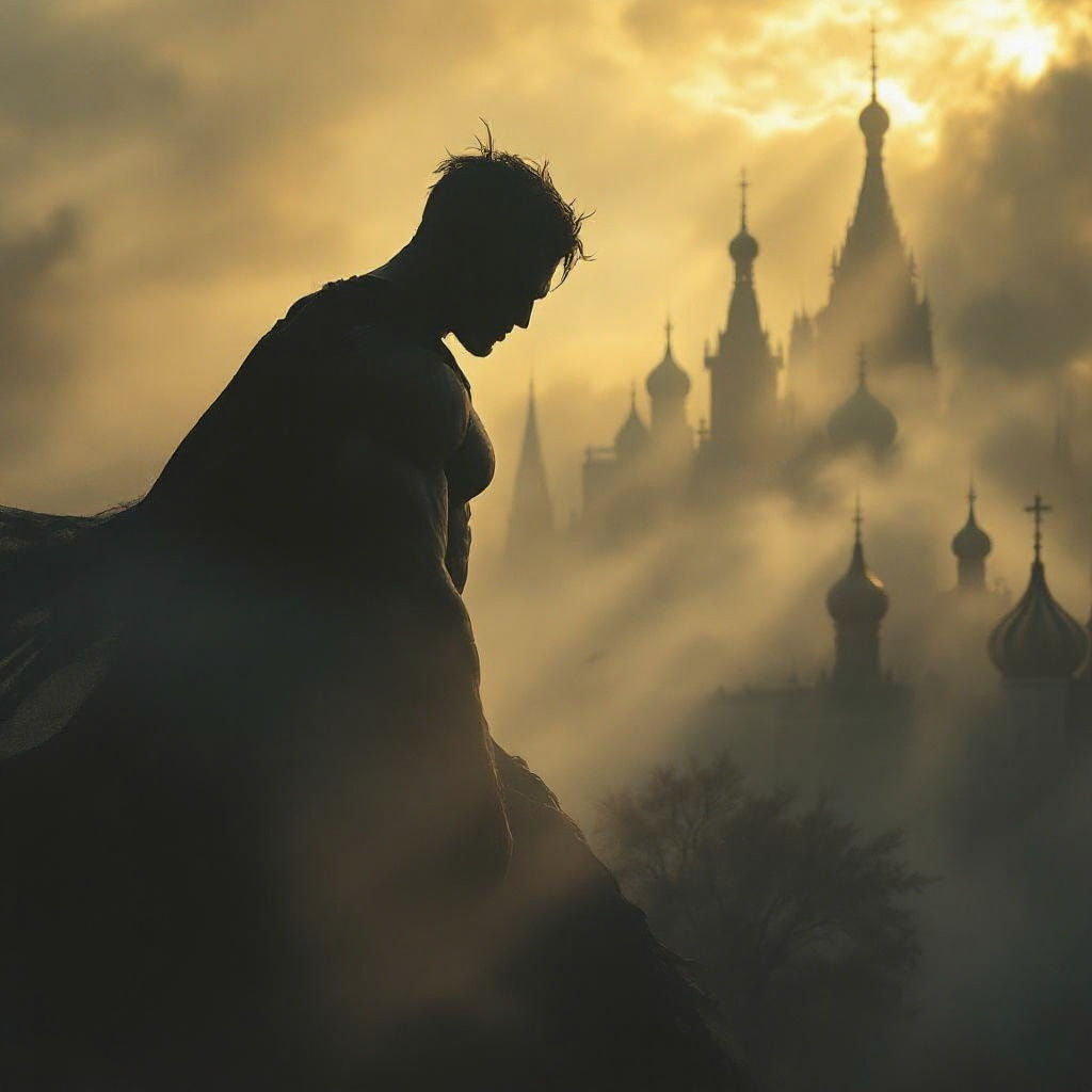 This image shows a muscular figure silhouetted against a Saint Petersburg cityscape at golden hour. The scene is filled with mist, golden light rays and autumnal colors, creating a romantic yet creepy ambiance.