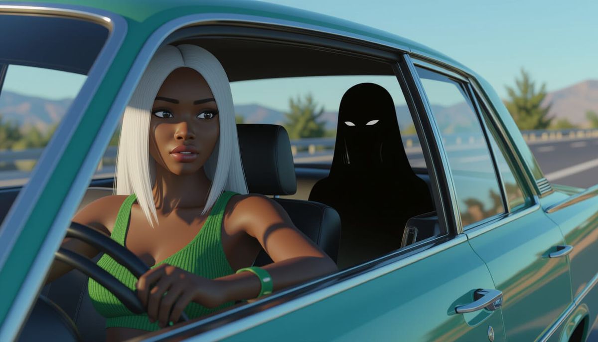 A hyperrealistic, animated style portrait shows a young African woman driving, glancing fearfully at a shadow figure in her car's mirror. Cinematic lighting emphasizes dramatic contrast.