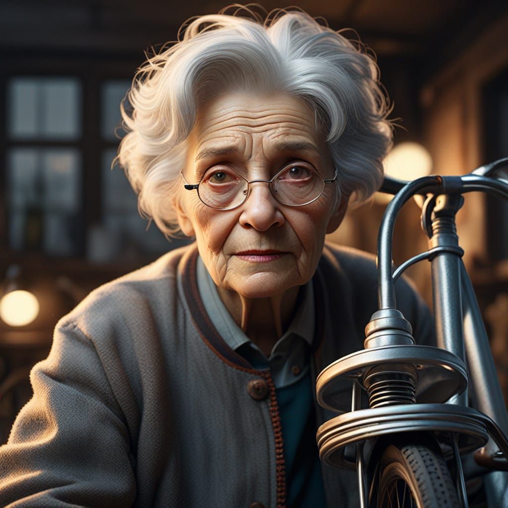 A striking picture of an elderly woman with silver hair perched on a vintage bicycle. The image evokes a dreamy, melancholic mood through soft colors and a nostalgic, vintage aesthetic reminiscent of classic children's book illustrations.
