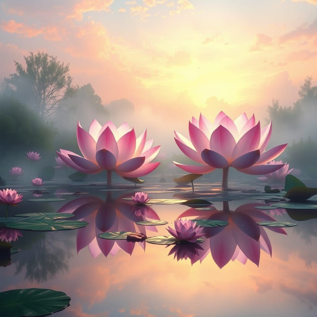 This enchanting image depicts a serene pond at dawn, reflecting the soft pastel hues of the sunrise. Giant lotus flowers float on the water's surface, their petals glowing with an ethereal light amidst a misty atmosphere, blending impressionist and fantasy elements in a dreamlike scene.