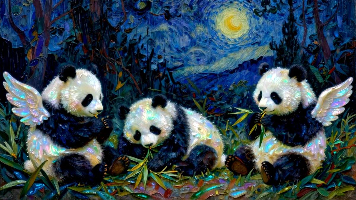 "textures of thick impasto icing light Japanese painting Portrait 4 cute adorable panda bears Photorealistic Nighttime moon-rain in a fantas...