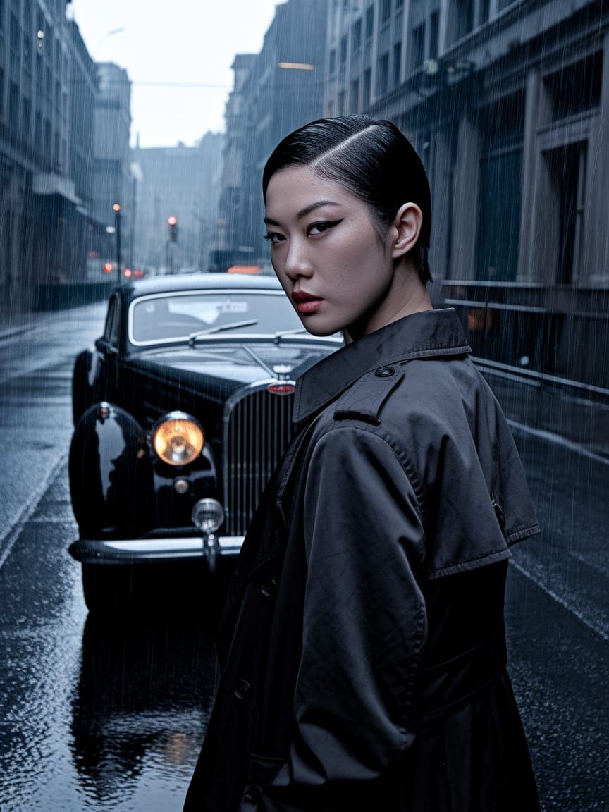 This image shows a stylish Asian woman in a trench coat next to a vintage car on a wet city street. The scene is rendered with high-contrast lighting and cinematic splash art.