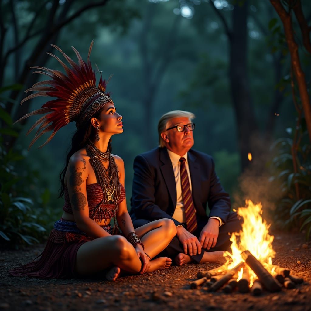 This image depicts a serene Amazonian woman, adorned in traditional attire, sitting by a warm fire in a lush rainforest village, gazing up at the star-filled night sky, accompanied by a bespectacled figure in a tailored suit, amidst the sounds of the rainforest.