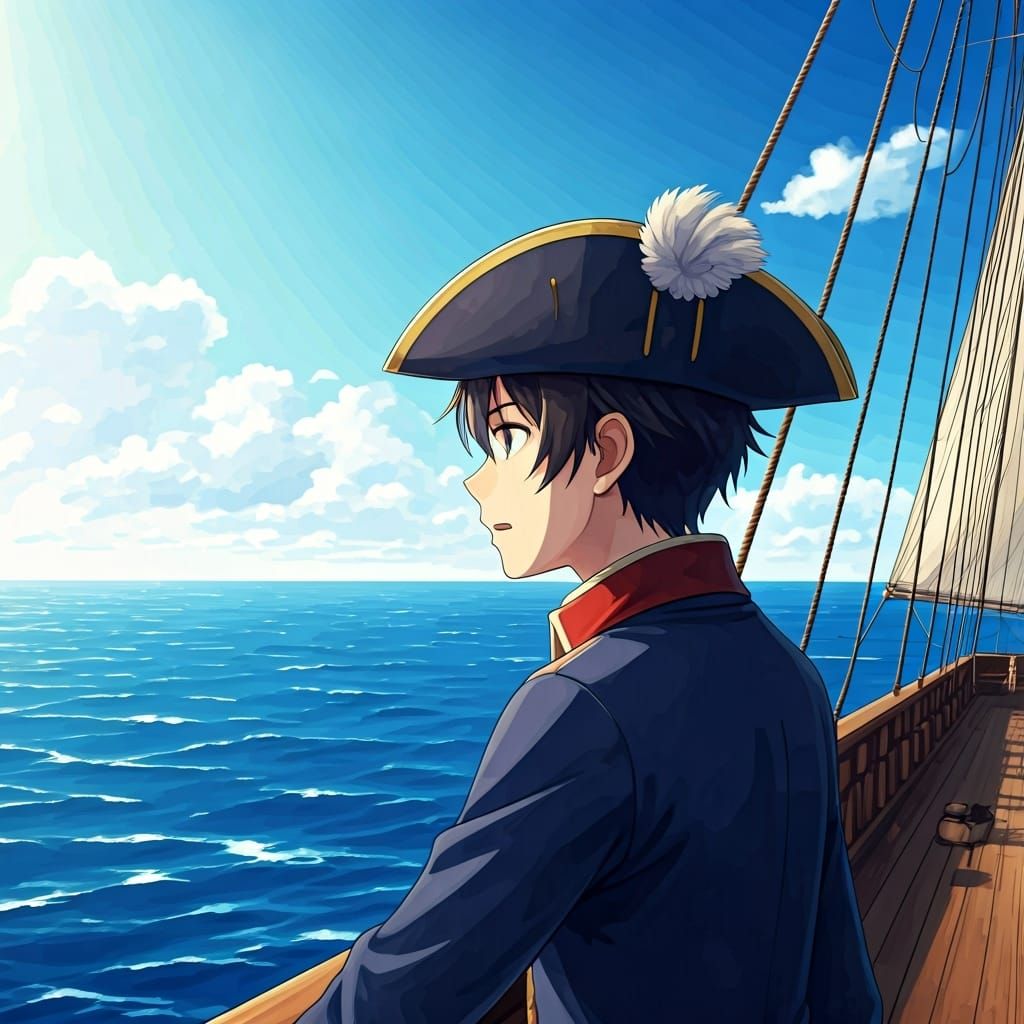 This image shows a youthful deckhand in a tricorn hat, perched on a ship's rigging, gazing at the expansive ocean under a clear sky in vibrant anime style.