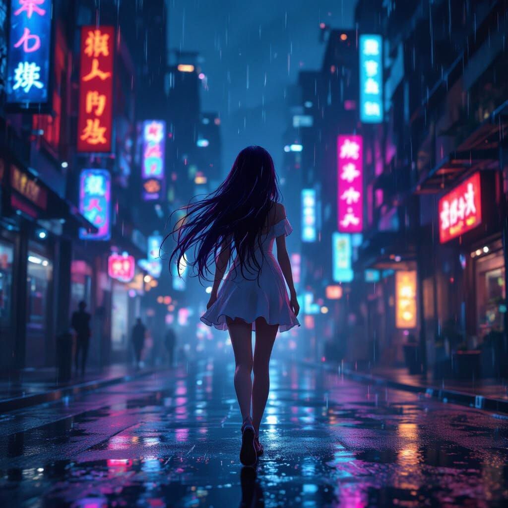This image shows an anime girl with purple hair in a white dress walking through a dark, rain-slicked city at night. Neon lights create vibrant reflections on the streets in a fantasy concept art style.