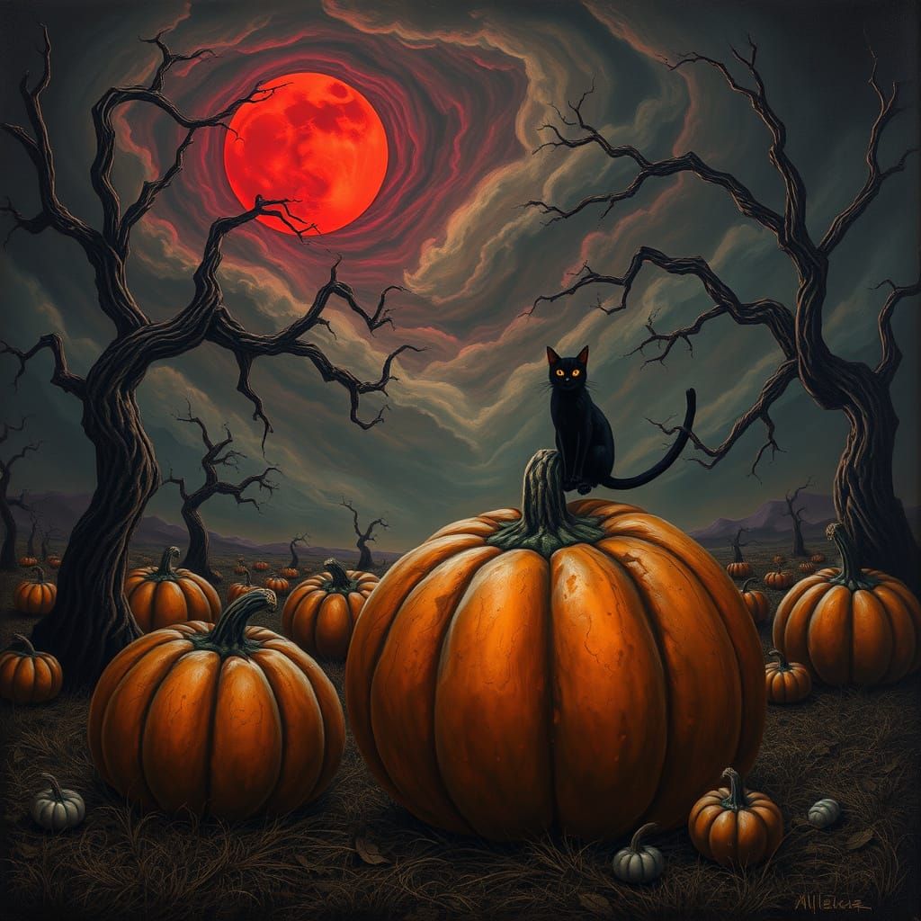 A dark fantasy scene with giant, glowing pumpkins under a blood-red moon. Skeletal trees and a black cat add to the eerie, textured oil painting atmosphere.