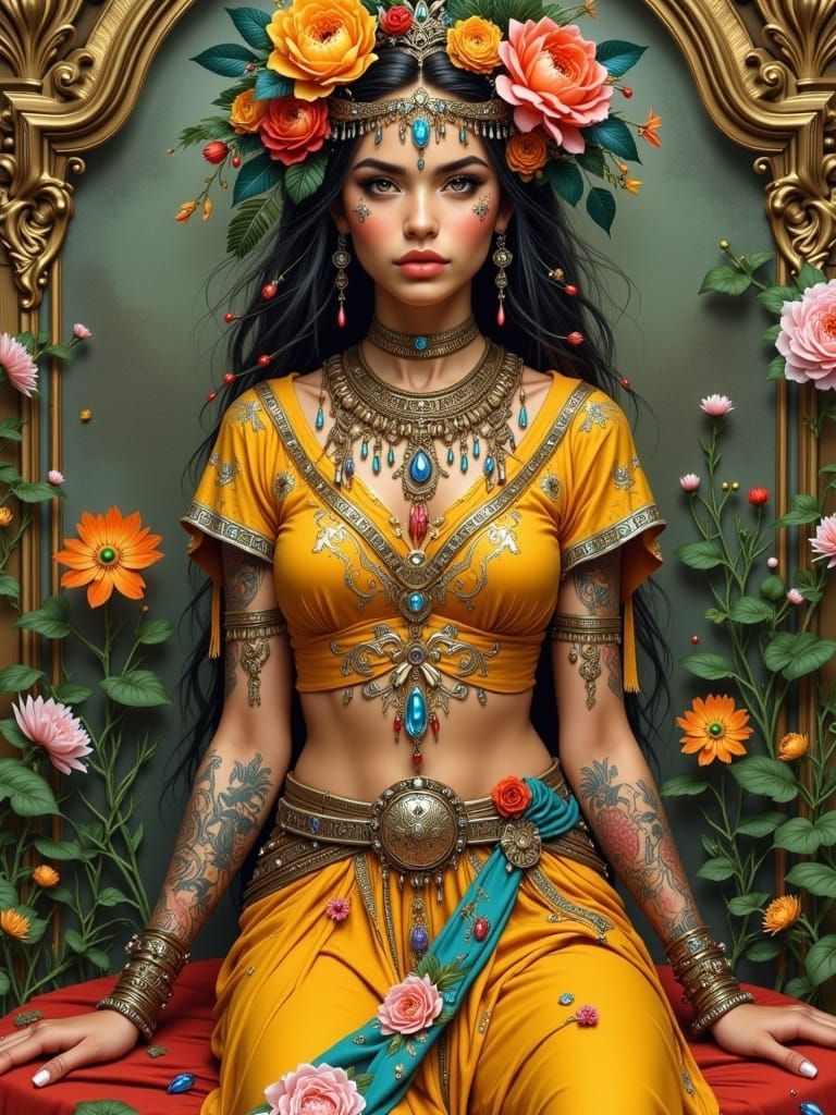 A photorealistic portrait of a princess in a golden tunic with intricate embroidery and a head dress adorned with vibrant flowers, set amidst a mystical and dreamlike atmosphere