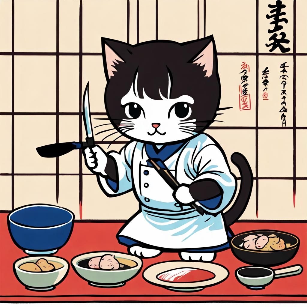This image shows a kitten in a kitchen scene, rendered as Japanese calligraphy. The artwork evokes traditional Japanese art styles with its minimalist aesthetic.