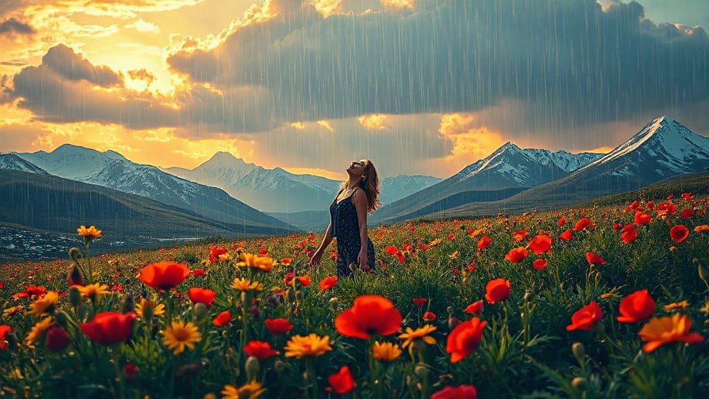 Easily generate unique images of figures in wildflower fields with summer rain, using our free AI tool.