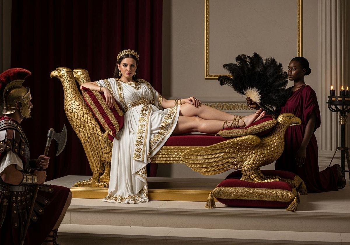 This image shows a Roman Empress relaxing on an eagle-shaped chaise lounge in her throne room. Servants attend her in the well-lit imperial palace in a luxurious, classical aesthetic.