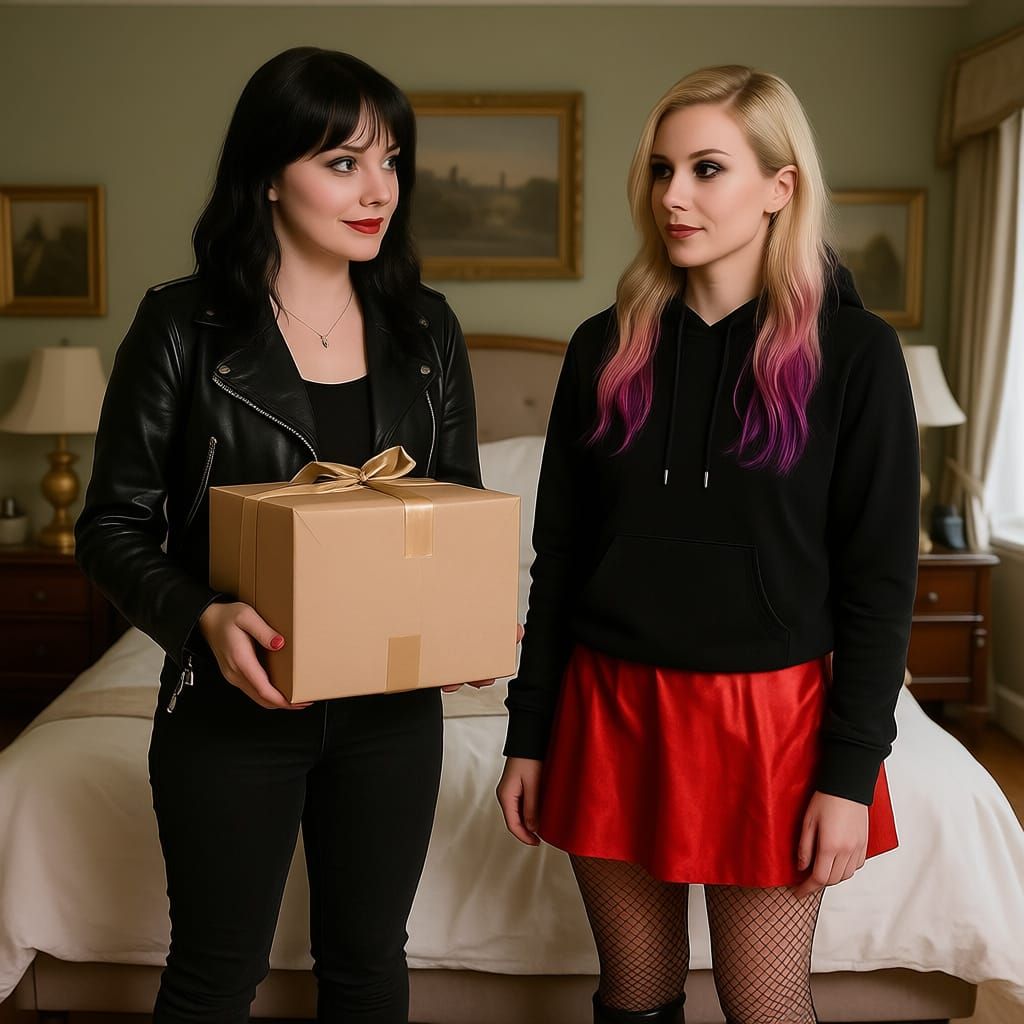 This hyperrealistic image shows two smiling women in a detailed bedroom of an English country house. One woman wears a leather jacket, the other a gothic outfit.