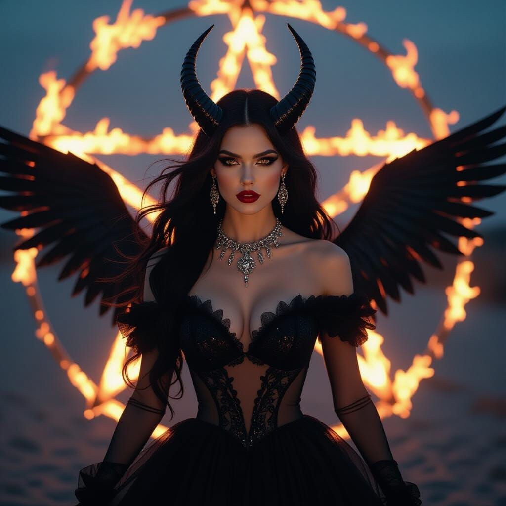 This image shows a striking goddess with horns and fiery wings against a night sky. She is adorned with dramatic makeup and jewelry, flying before a blazing pentagram. The image has a cinematic feel with film grain and lighting.