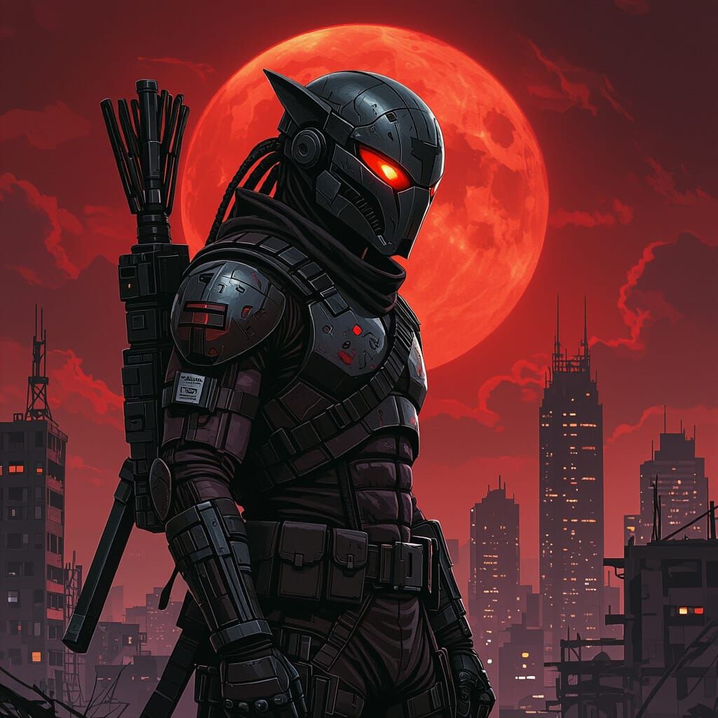 This digital painting shows a lean Yautja hunter in iconic gear overlooking a dark, post-apocalyptic city bathed in the crimson glow of a blood moon. Dramatic lighting and deep shadows create a gritty atmosphere.