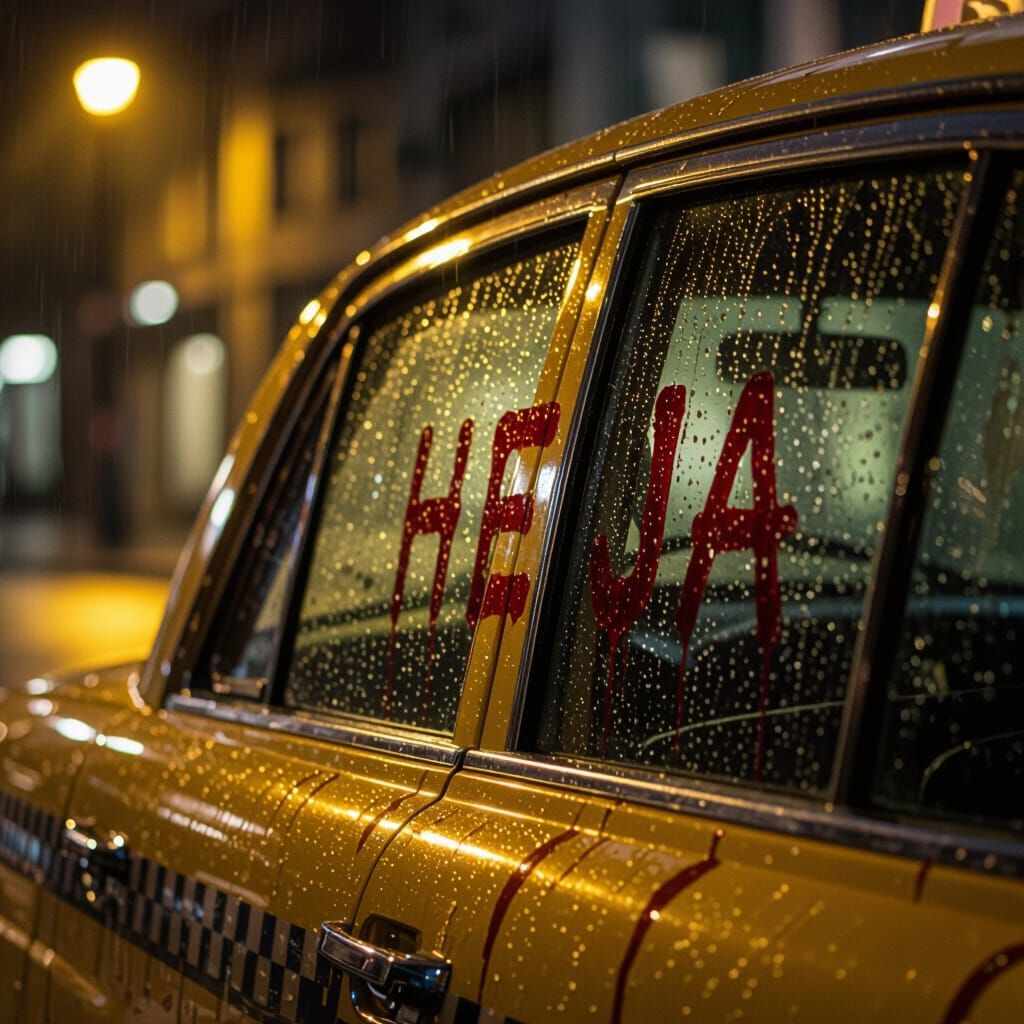 A cinematic close-up captures a taxi window at midnight, with 'Heja' written in blood on the wet, rain-streaked glass. Eerie streetlight creates a moody, ultra-realistic glow.