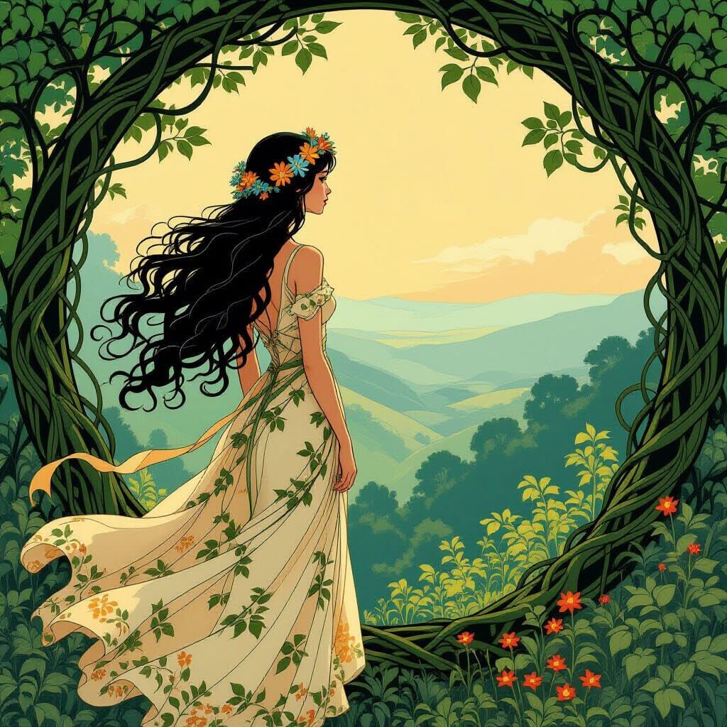 A captivating image of a woman with flower-adorned hair in a verdant forest. She is dressed in a gown made of vines and leaves, and rendered with intricate art nouveau details.