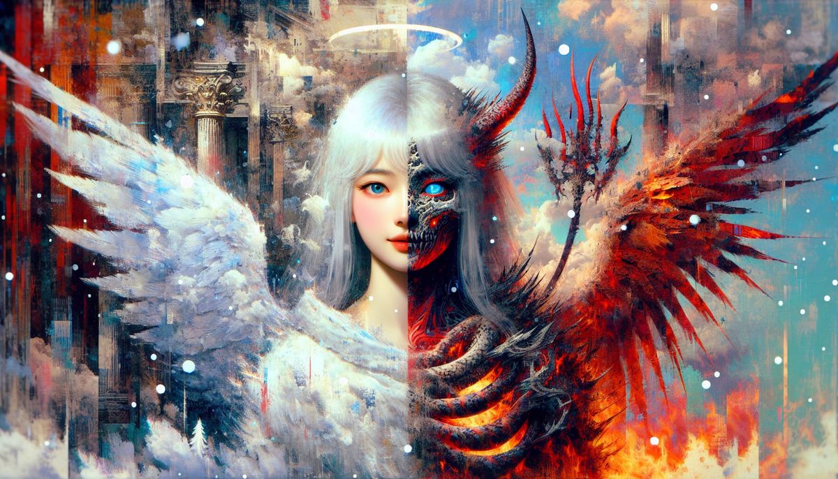 This image shows a surreal double exposure portrait of a woman with angelic and demonic features. The digital painting blends glitchcore aesthetics with rough brushstrokes and a grainy, vintage texture.