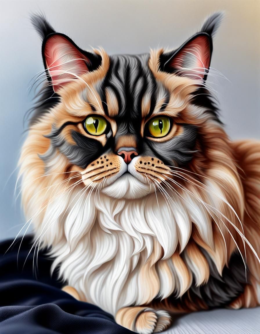 This image depicts a highly detailed, ultrarealistic Persian cat. The AI has rendered the feline with striking clarity, emphasizing its luxurious fur and expressive features.