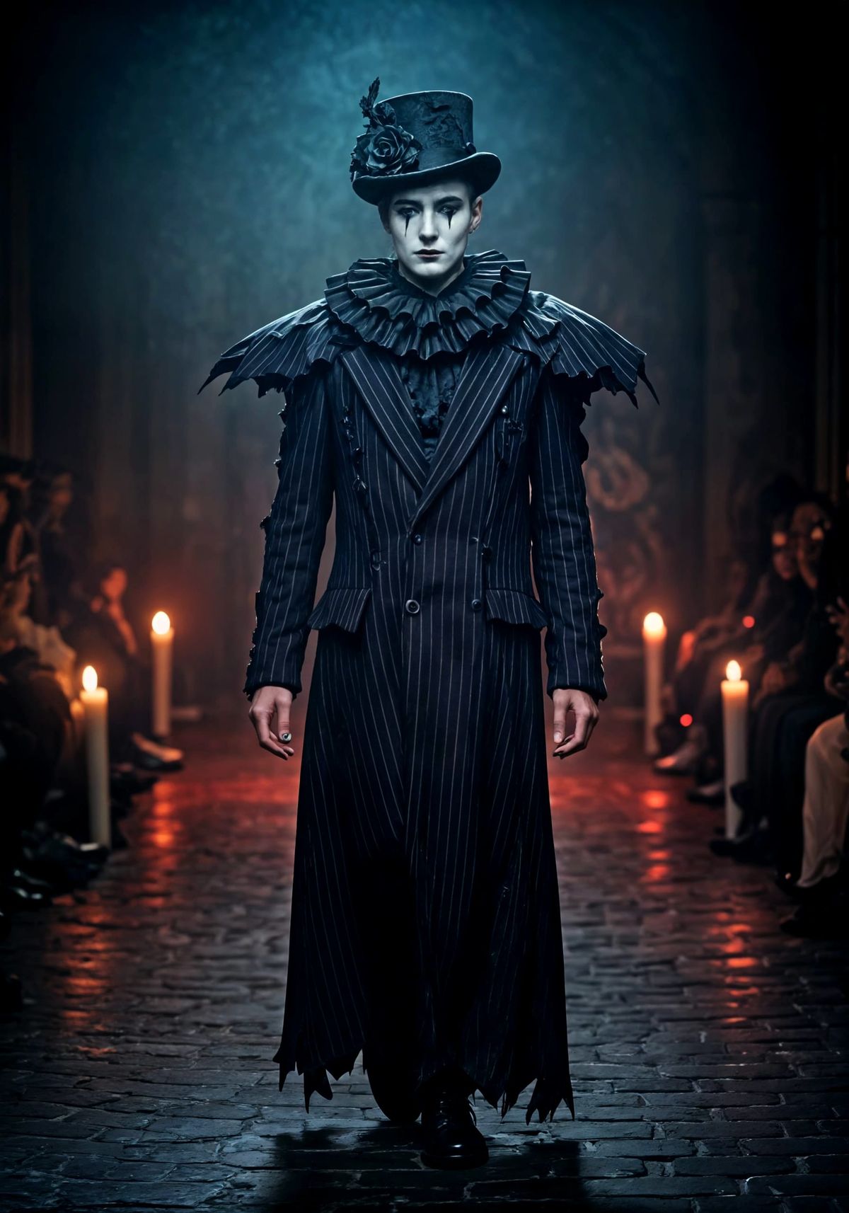 A haunting image of a gothic mime figure, clad in a long, striped coat and top hat, glides through dimly lit candlelight, their white face paint and classic mime stripes evoking a sense of macabre elegance and Victorian melancholy.