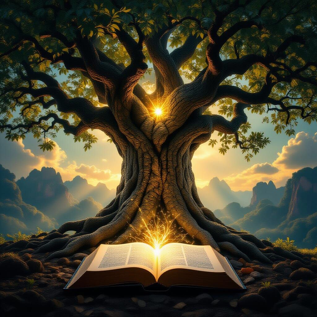 A cinematic image of majestic magical light flowing from an open book depicting the ancient Kabbalistic Tree of Life. Rich, dark tones and dramatic lighting create an atmospheric masterpiece.