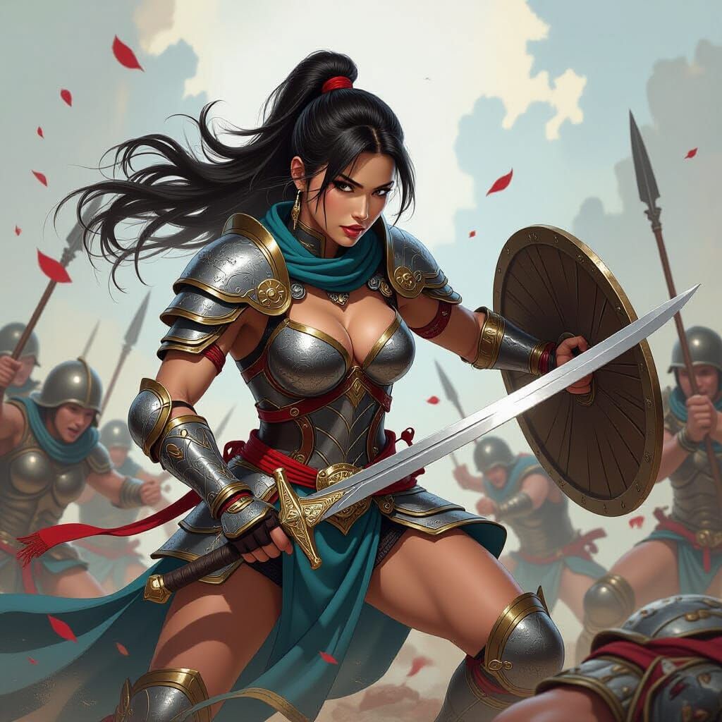 A dynamic image portrays an Asian woman warrior battling enemy troops. She wields a sword and shield in this action scene, rendered with vibrant colors and detailed textures.