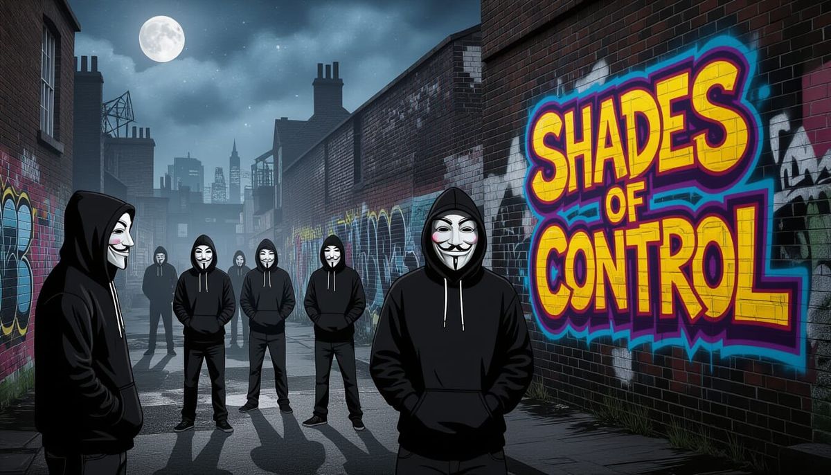 A digitally generated image of figures in hoodies and Guy Fawkes masks gathered on a misty London street. Graffiti in an urban street art style adorns a nearby wall.