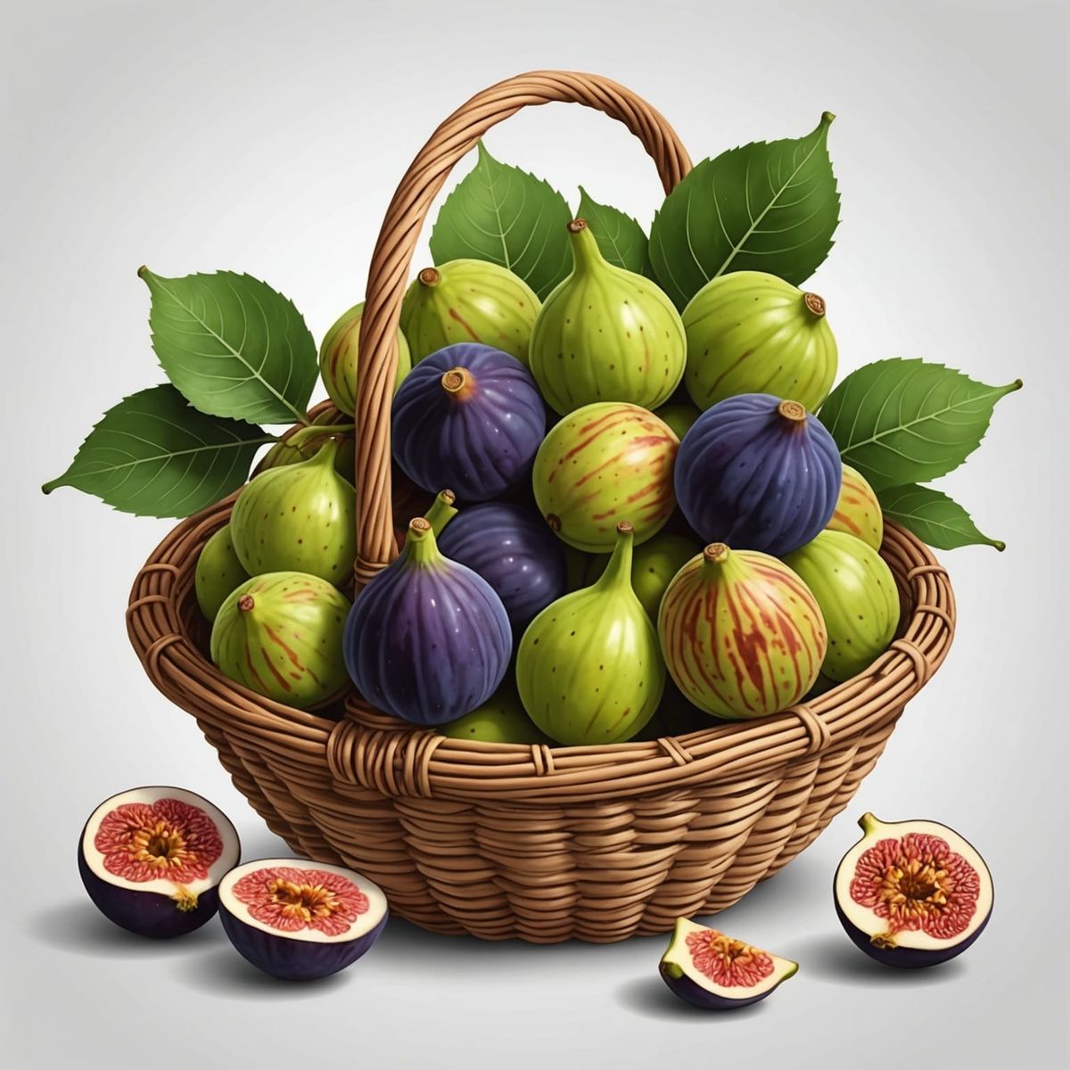 A vibrant image showcasing a cartoon-style basket filled with Indian fig fruits. The drawing features clean black outlines against a stark white backdrop, emphasizing the fruit's colors.