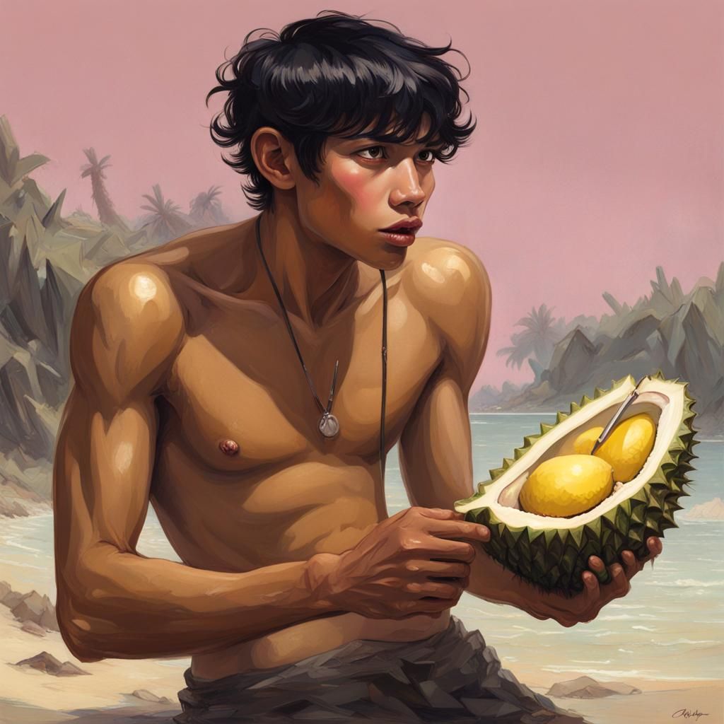 A digital portrait of a young Indonesian man with wavy black hair eating durian. The image is rendered with dark, dramatic elements.