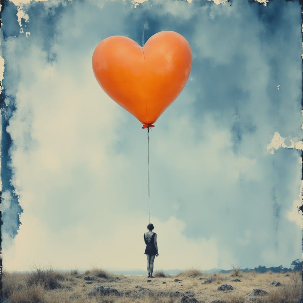 This image shows a surreal depiction of love, perhaps a balloon or baboon, rendered in a cyanotype-like style with vellum textures, creating a dreamlike aesthetic.