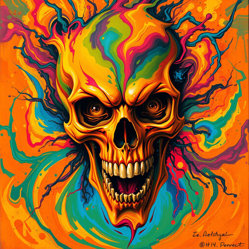 This image shows an abstract skull-like face with distorted features in a chaotic, expressive style. Swirling shapes and a vibrant color palette evoke intense emotion and dynamic energy.