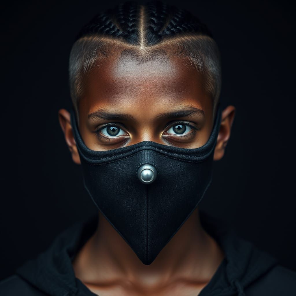 This image shows a frightening 12-year-old with dark skin wearing a tight, jet-black mask. The boy has short, tight, black braids in a dark and mysterious atmosphere.