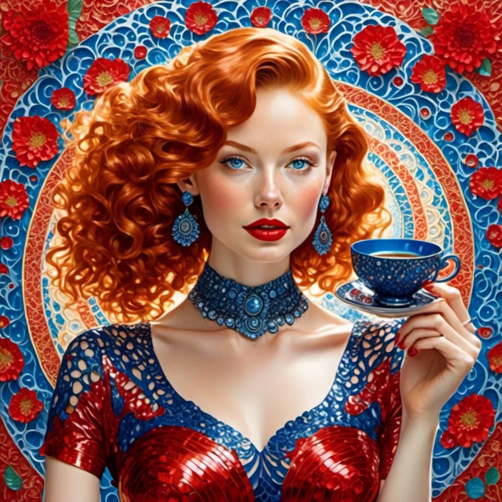 A digital portrait of an attractive red-haired woman with blue eyes wearing a red latex dress, in a Jerry Pinkney art style. The background features mandala and zentangle elements.