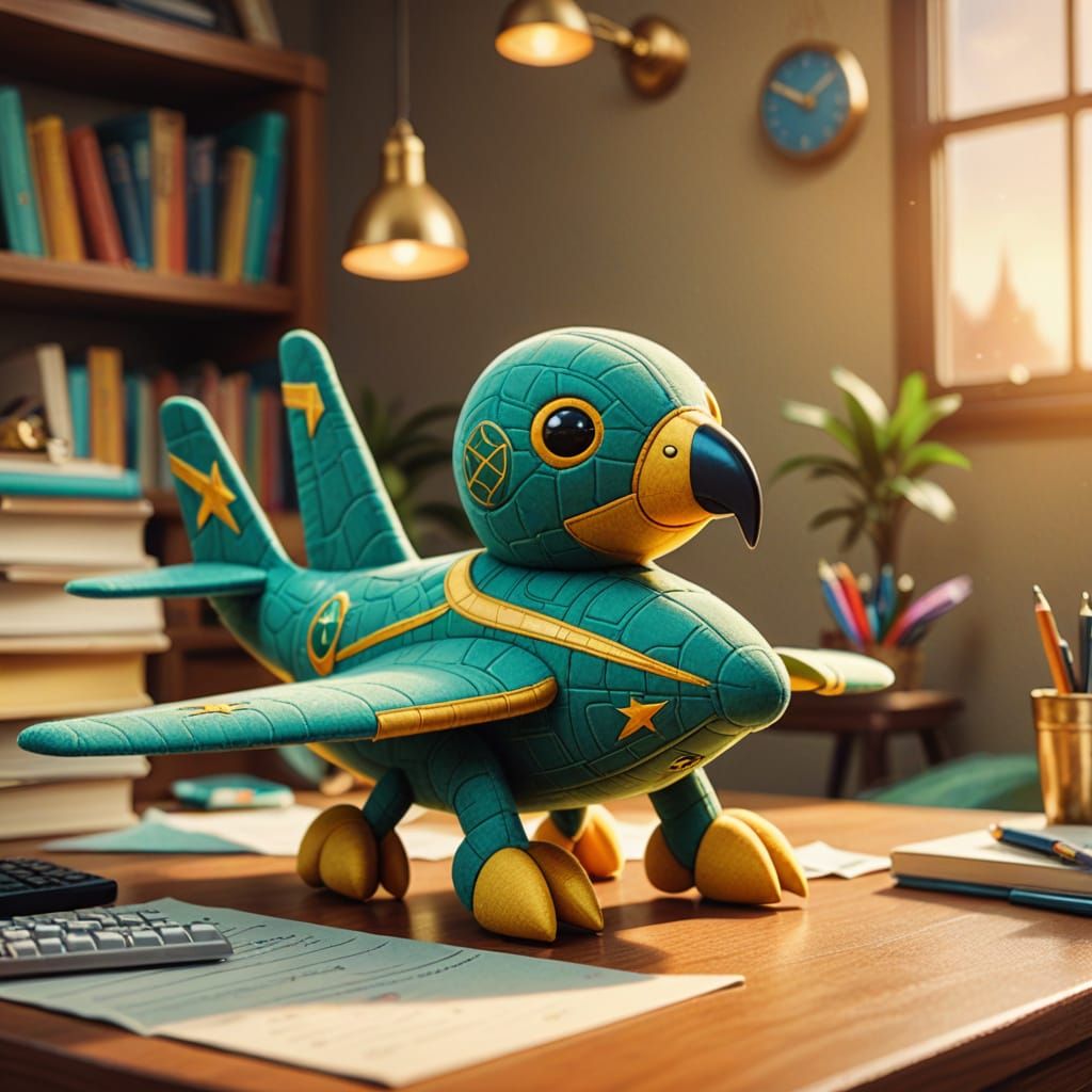 This image shows a colorful, cartoonish illustration of a plush toy Romulan Warbird on a desk, with soft textured fabrics and warm golden lighting, creating a playful and whimsical atmosphere.