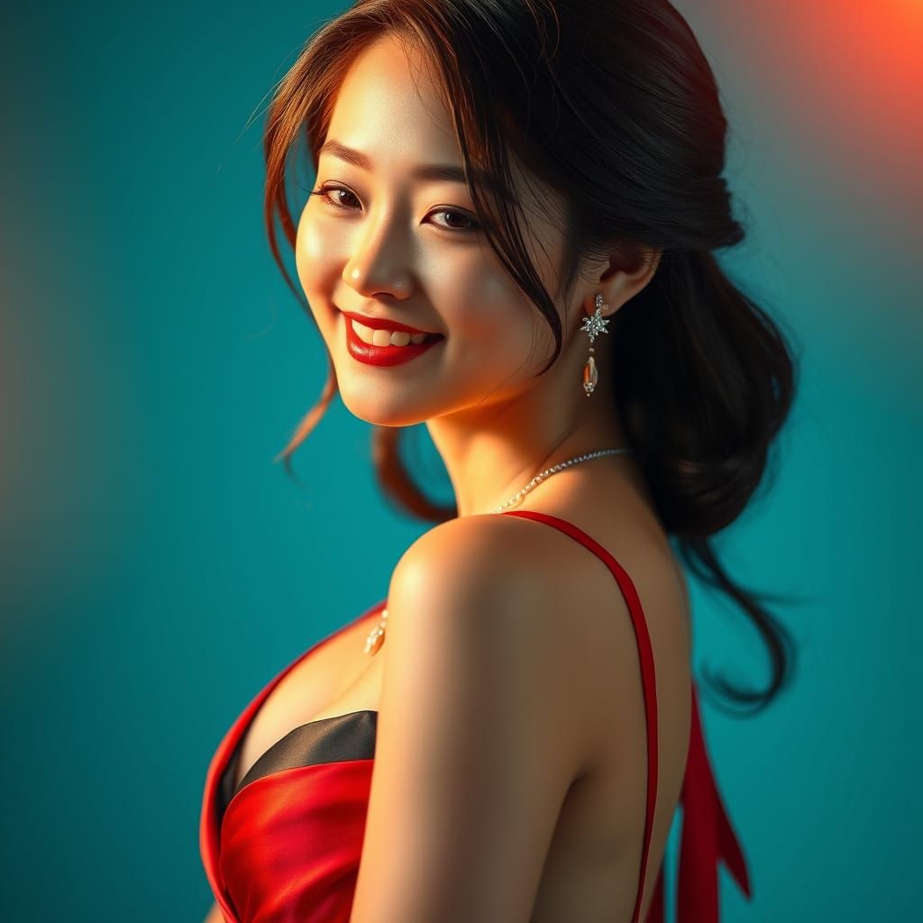 A serene and happy Japanese woman is depicted in a highly stylized portrait, adorned in a stunning red and black silk bra top, diamond jewelry, and set against a dreamy cerulean blue background, evoking a sense of romantic longing and glamour, reminiscent of Eastern art and fantasy